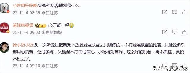 有球迷点评说道:“头一次听说过把新秀下放到发展联盟去只训练的,不打发展联盟的比赛…只能说俱乐部用心良苦,让他多练,又确保不打击他信心…小杨得刻苦啊,这么好的机会,再不抓住,真说不过去了”。